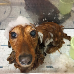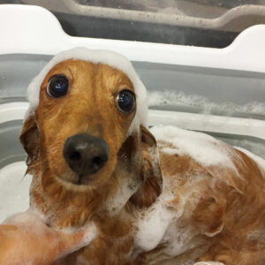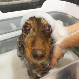シャンプーで洗って、前肢の飾り毛を整えたり、